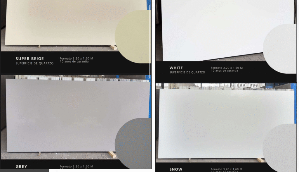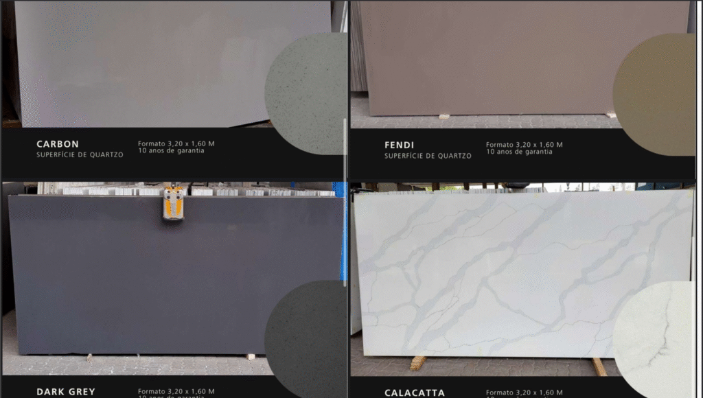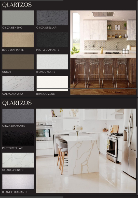 As Superfícies de Quartzo são pedras industrializadas.O produto é composto por 93% de Quartzo Natural (um dos mais resistentes minerais da natureza), polímeros e corantes. O resultado é um produto belíssimo, resistente, prático e, com longo prazo de garantia. Possui grande variedade de cores e é versátil na sua utilização tanto em áreas internas quanto externas. Quartzo oferece uma seleção incomparável de mais de 60 cores, proporcionando uma variedade excepcional para combinar perfeitamente com o estilo e a estética da sua cozinha ou banheiro.