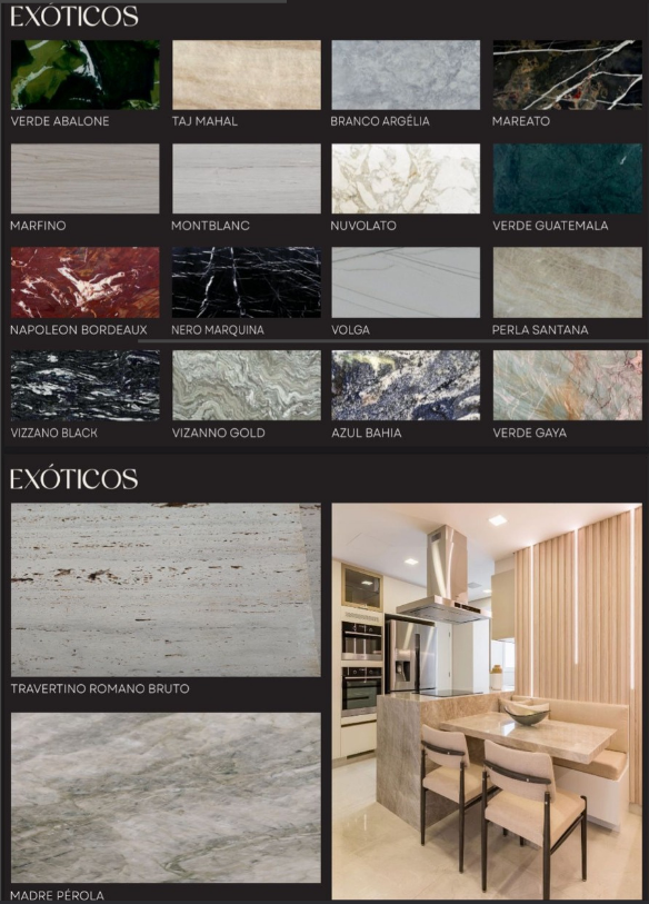 São materiais raros e preciosos, muitas vezes com cores e padrões únicos, que são apreciados na arquitetura e design de interiores por sua singularidade e beleza natural. Estes materiais podem incluir granitos, mármores, quartzitos, entre outros, que não são encontrados em larga escala e possuem características especiais.